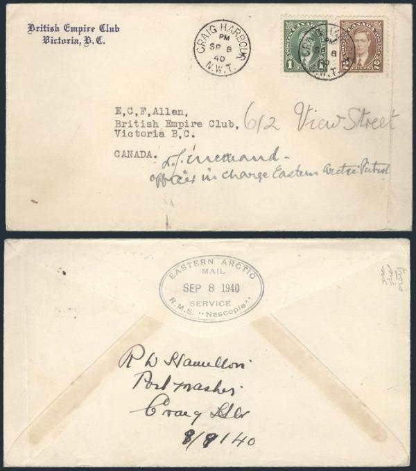 231-2, Tied by Craig Harbour, NWT 8 Sept 1940 CDS on ship cover with "EASTERN ARCTIC / MAIL / SERVICE / R.M.S. Nascopie" 8 Sept 1940 oval cancel on back flap. Has British Empire Club, Victoria, BC corner card & is addr to same. SIGNED on reverse by "R.W. HAMILTON, Postmaster, Craig Harbour" & on front by MAJOR D.L. MCKEAND "officer in charge Eastern Arctic Patrol" (an authority on the Cdn Arctic). F, vertical edge fold. Historic Arctic related item (Image)