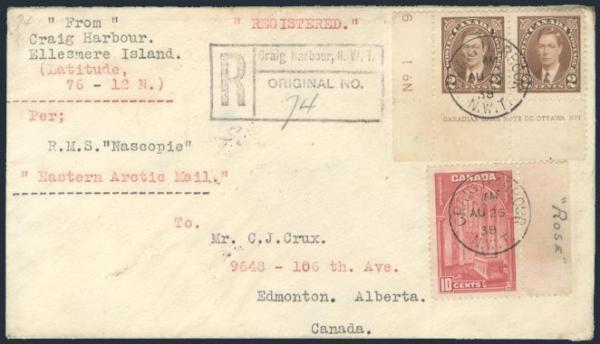 232 (Pl 1 Pair), 241a, With Craig Harbour, NWT 26 Aug 1938 CDS's on Reg'd cover to Edmonton, Alta. Has "EASTERN ARCTIC / MAIL / SERVICE / R.M.S. Nascopie" oval b/s & Fort Vermilion & Winnipeg RPO transit. F, a bit affected by moisture (Image)
