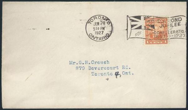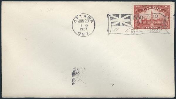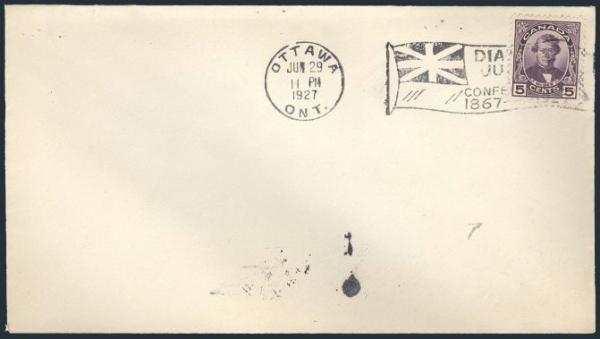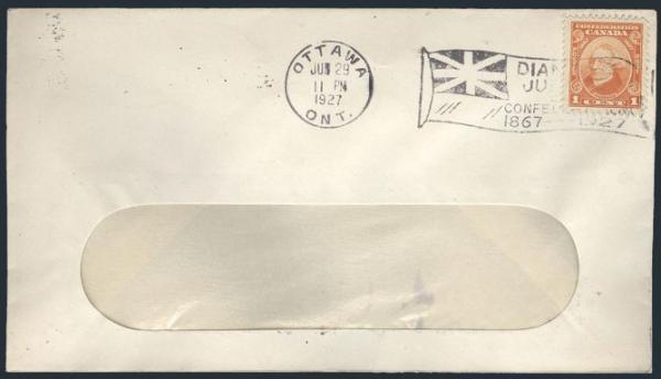 142, FDC with Ottawa 29 June, 1927 "Diamond Jubilee" Flag cancel (with additional cancel on reverse). F, unaddr (Image)