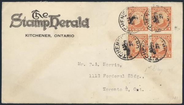 141 (Block), With each stamp tied by Kitchener Ont 29 June, 1927 CDS on FDC. Has corner card for "The Stamp Herald" of Kitchener and addr to Toronto. F, cover has rib toning (Image)