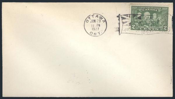 146, FDC with Ottawa 29 June, 1927 "Diamond Jubilee" flag cancel (with an additional strike on reverse). F, unaddr (Image)
