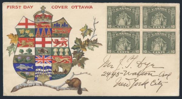 209 (Block), Neatly tied by Ottawa 1 July, 1934 CDS's on FDC with gorgeous JTB HAND PAINTED COLOUR CACHET. Depicts a Canadian Coat of Arms. Addr to New York City. VF (Image)