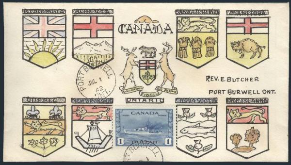 262, $1 Destroyer FDC from Port Burwell, ont 1 July, 1942. Has a superb BUTCHER HAND DRAWN CACHET DEPICTING PROVINCIAL SHIELDS. VF. A SPECTACULAR COVER! (Image)