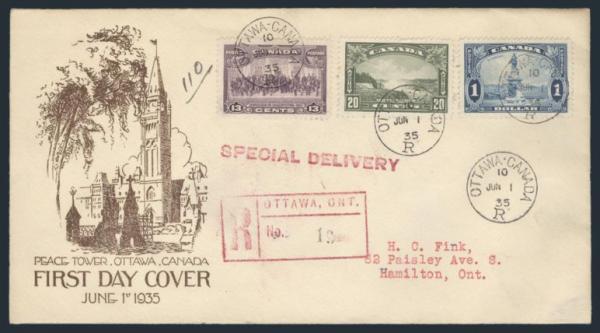 224-5, 227, VF High Values up to $1 Champlain neatly tied by Ottawa 1 June, 1935 CDS's on Reg'd Special Delivery cach FDC to Hamilton, Ont. Has 3 diff RPO b/s's. VF (Image)