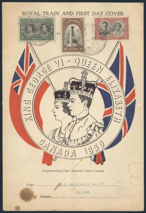 246-8, Large size colour cach ROYAL VISIT FDC with ROYAL TRAIN 15 May 1939 cancels (in French) to Ottawa. Cachet depicts the Royal Couple Red Ensign & Union Jack. F, small flts (Image)