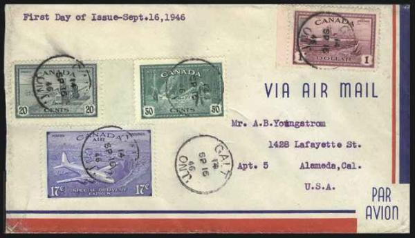 268-73, C9, CE3, Tied by Galt, Ont 16 Sept 1946 CDS's on 2 Airmail FDC's to USA. F-VF (Image)