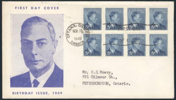 288, Block of 8 neatly tied by Ottawa 15 Nov, 1949 cancel on FDC with portrait of KGVI. VF (Image)