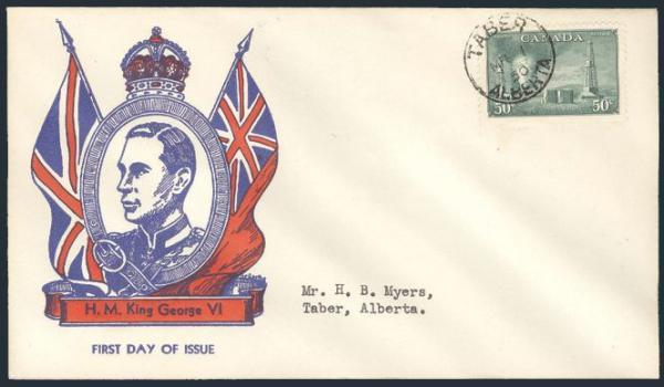 294, Tied by Taber Alberta 1 Mar, 1950 CDS on lovely FDC with coloured "Garthe" cachet. VF (Image)