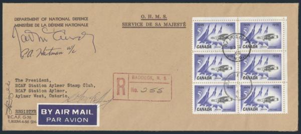 383 (Block of 6), With Baddeck, NS 23 Feb 1959 F.D. cancels on Reg'd Airmail OHMS Dept of Defence cover. This was the 50th Anniversary of the first flight in Canada. SIGNED by PILOT of the first flight J.A. MCCurdy; Commander P. Hartman who flew the 1959 replica; Baddeck Postmaster Langille; and L. McCaffrey Designer of the replica. VF. A must addition to an aviation collection (Image)