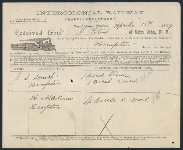 CANADA 1889 RAILWAY WAYBILL: Intercolonial Railway Waybill from St. John Station 13 Apr, 1889 for a shipment of barb wire, etc. to Hampton. VF