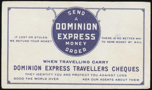 CANADA DOMINION EXPRESS CO: DOMINION EXPRESS Co. circa 1910 blue on grey Advertising Blotter promoting money orders & traveller's cheques. F-VF (Image)