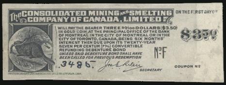 CANADA MINING CO. BOND COUPON: Old CONSOLIDATED MINING & SMELTING Co. OF CANADA $3.50 Bond Coupon depicting a nice Beaver engraving. F. Attractive collateral item (Image)