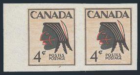 CANADA INDIAN HEAD ESSAY: Scarce imperforate margin pair of the 4¢ INDIAN HEAD ESSAY. This was an unadopted design from the 1950's. VF, NH (Image)