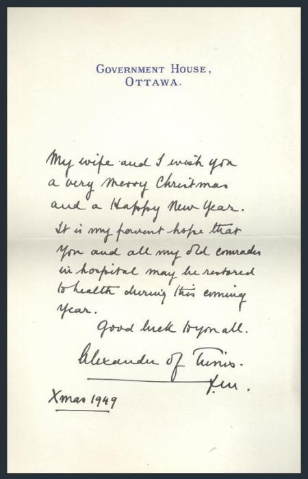 CHRISTMAS 1949 MESSAGE FROM THE GOVERNOR GENERAL: Christmas 1949 printed message to Canadian WWII Veterans signed by the Governor General LORD ALEXANDER OF TUNIS. On Government House, Ottawa stationery. VF (Image)