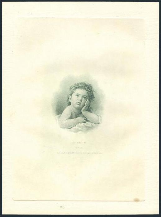 CANADA LARGE DIE ESSAY: Canadian Bank Note Co. Montreal large engraved DIE ESSAY from the 1950's era, die sunk on India on card (112 x 149 mm). Depicts a CHERUB in green, with inscription and Die "V-12". VF, one minute corner stain. Scarce (Image)