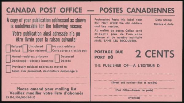 CANADA POSTAGE DUE LABEL: Large size pink Canada Post Office bilingual label for 2¢ Postage Due for publications, circa 1950's. VF, full OG. Scarce (Image)