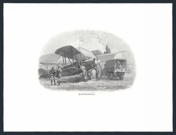 CANADA ENGRAVING: Canadian Bank Note engraving depicting a vintage bi-plane being loaded with mail. VF (Image)