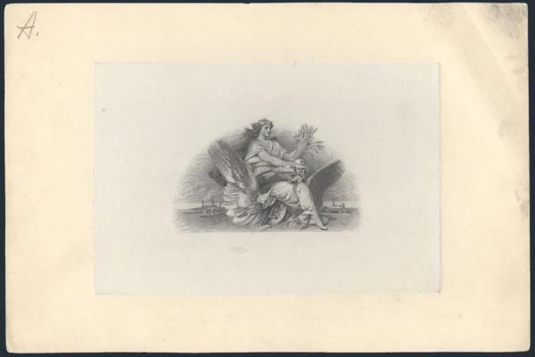 CANADA ENGRAVED VIGNETTE: Large engraved die sunk VIGNETTE (151 x 101 mm) on wove paper on card (228 x 152 mm) of FEMALE ALLEGORICAL FIGURE shown seated atop a winged wheel holding sheaf of wheat and agricultural products. Has violet Canadian Bank Note Co. 28 July 1947, Ottawa b/s. F-VF, card creased at UR with light ink finger prints. Lovely showpiece! (Image)