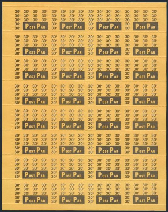 CANADA POSTAL STRIKE LOCALS: Complete mint sheet of 32 POST PAR 30¢ Local stamps, from Montreal 1988, black on orange issue. VF, NH (Image)