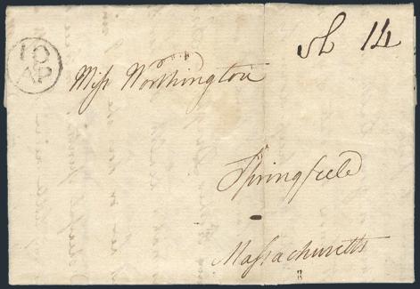 Stampless cross border folded letter datelined St John NB 22 March, 1799 addr to Springfield, Mass. Has circular USA Bishop Mark "10Ap". Inside has a family letter. An early ship letter. F (Image)