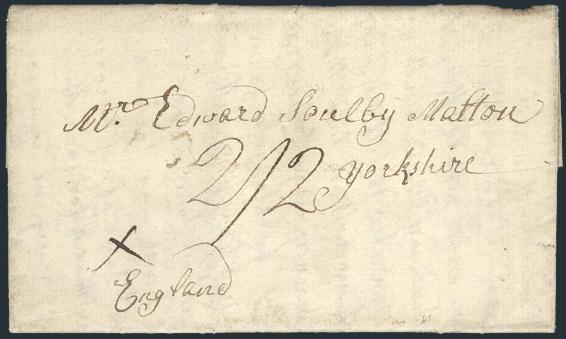 Stampless folded letter datelined Sackville 25 Feb, 1811 to Malton, Yorkshire England rated "2/2". Has faint Halifax transit. Possibly carried by the ship "Adventure" from New York. Has lengthy legible letter regarding life & family news in early New Brunswick, loading lumber for ships bound for England, etc. F (Image)