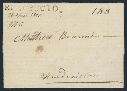 Miniature size stampless cover with scarce "RICHIBUCTO" straightline with m/s date 26 April, 1826. This is the earliest reported strike as per J.R. Saint exhibit. Addr to Fredericton and rate 'IN3'. VF (Image)