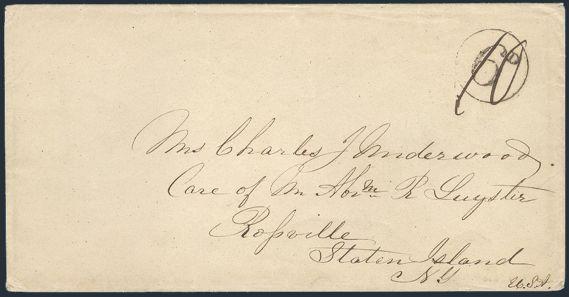 Stampless cross border cover from Bathurst NB 25 Ju, 1854 (b/s) to Staten Island, New York. Has 6d rate h/s overrated to "10". F (Image)