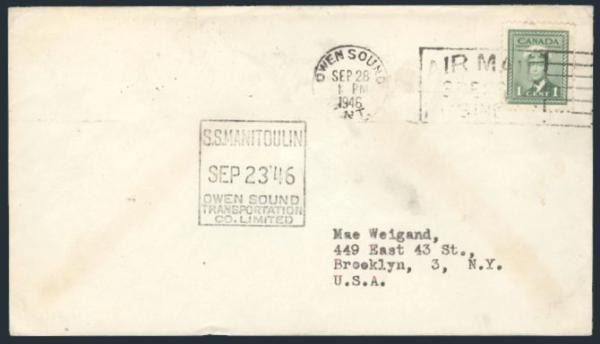 249, Tied by Owen Sound, Ont 28 Sept 1946 slogan cancel on ship cover to USA. Has boxed "S.S. MANITOULIN / OWEN SOUND / TRANSPORTATION / Co. LIMITED" 23 Sept 1946 cancel. UNLISTED. F-VF (Image)