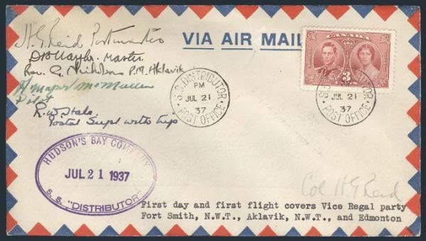 Ludlow #'s S-171 (RF 500), S229 (RF 460), HUDSON'S BAY / COMPANY / S.S. "DISTRIBUTOR" & S.S. "DISTRIBUTOR POST OFFICE" cancels on FORT SMITH to AKLAVIK VICE-REGAL PARTY ARCTIC TOUR FFC. SIGNED by 3 diff Postmasters plus R.W. Hale postal Superintendent & A. Mc Mullen, Pilot. Addr to Colonel H.G. Reid 21 July 1937. VF (Image)