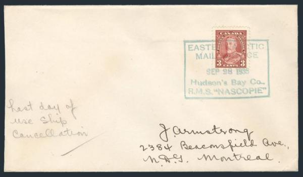 Ludlow #S-173b (RF 500), EASTERN ARCTIC / MAIL SERVICE / Hudson's Bay Co., / S.S. "NASCOPIE" 28 Sept 1935 blue green boxed ship cancel on cover to Montreal. Has "Last day of use ship cancellation" m/s in pencil. VF (Image)