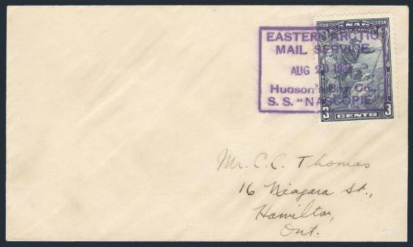 Ludlow #S-173b (RF 500), EASTERN ARCTIC / MAIL SERVICE / Hudson's Bay Co., / S.S. "NASCOPIE" 20 Aug 1934 violet boxed cancel on ship cover to Hamilton, Ont. F-VF (Image)