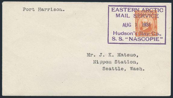 Ludlow #S-173b (RF 500), EASTERN ARCTIC / MAIL SERVICE / Hudson's Bay Co., / S.S. "NASCOPIE" 1 Aug 1934 violet boxed PROOF LIKE STRIKE on cover, from "Port Harrison" to Seattle. VF (Image)