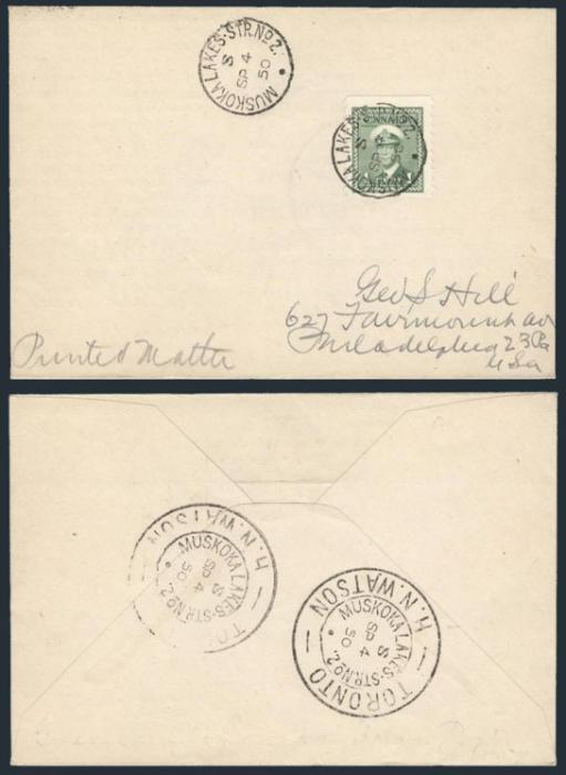 Ludlow #S-245 (RF 200), MUSKOKA LAKES STR No 2 / S 4 Sept 1950 to USA, struck twice. Also has 2 strikes on reverse with UNLISTED "TORONTO / H.N. WATSON" large ring cancel surrounding S-245 (Image)