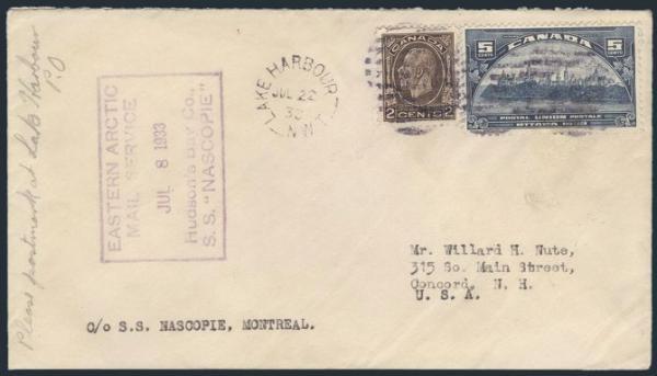 Ludlow #S-173b (RF 500), EASTERN ARCTIC / MAIL SERVICE / Hudson's Bay Co. / S.S. "NASCOPIE" 22 July 1933 beautiful violet boxed cancel on cover from Lake Harbour, NWT to USA. Has Moosonee, Ont. 10 Aug transit. F-VF (Image)