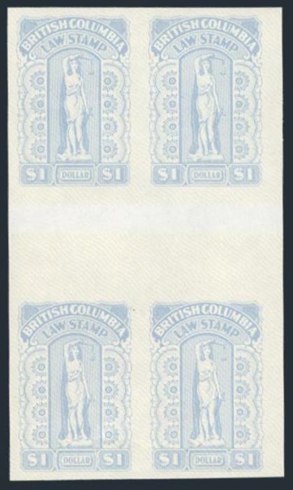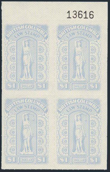 BCL63, UR corner number imprint block of the $1 Br. Columbia Law Stamp. Fresh, VF, NH. A NICE SPECIALTY ITEM (Image)