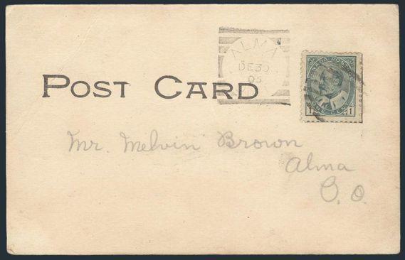 ALMA ONT (RF35, State II), Receiving cancel on KE 1¢ postcard. The Squared Circle is dated 30 Dec 1905 - Rare as only one other strike reported for 1905. F, corner crease, minor soiling (Image)