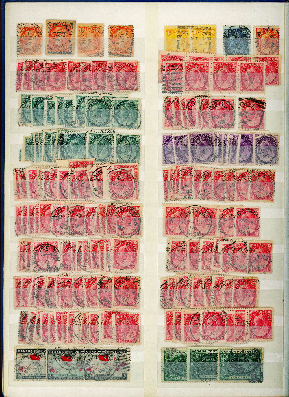 (#41/272) CANADA TOWN CANCELS 1894-1945, an over 5000 stamp fabulous lifetime accumulation in a packed 32 page Lindner stockbook, sorted by stamp issue all with SON readable cancels, many on higher value stamps noting #122 (x43), 145 (x48), 158 (x6), 159 (x13), 176 (x52), 177 (x9), 203 (x28), 209 (x40), 226 (x18), 227 (x13), 245 (x23), 262 (x21)++, includes most of the coils, BOB airmails, and special delivery, strength in cancels from BC, ALTA, SASK, and MAN, ex Bruce Longley with Scott cat for the stamps alone at over $5500 US ($8000 CDN), F-VF est ($300+ US) (Image)