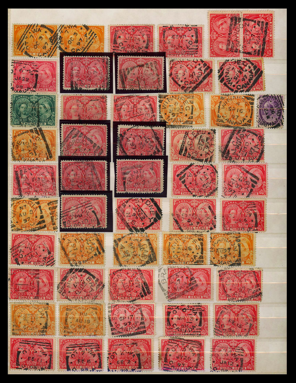 (#51,53) 349 CANADA TOWN CANCELS on JUBILEE STAMPS 1897-1898, a lifetime unchecked accumulation of mostly dated SON split ring and cds cancels, includes better Western Canada BC, ALTA, MAN, YUKON plus a nice group of QUEBEC cancels, ex Bruce Longley with Scott cat for stamps alone over $1400 US ($2000 CDN), mostly VF est ($200+ US)