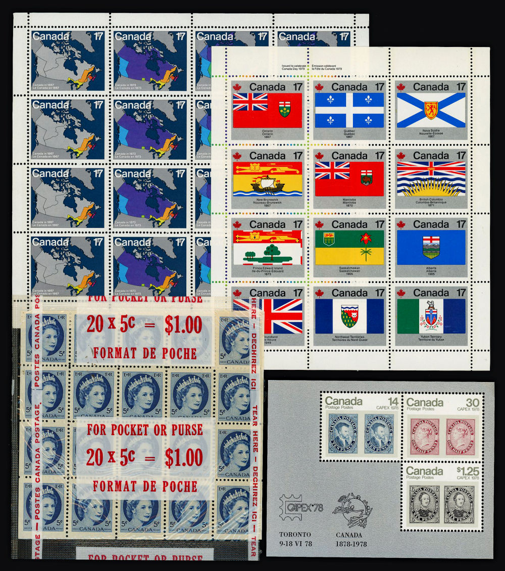 (#338AI/920) CANADA MNH SHEETS 1954-1980's, 77 full sheets + mini-sheets + souvenir sheets + 3 cello pack mini sheets, includes 44 of the Provincial flags mini sheet #832a, 10 of the Provinces mini sheets #893a, and 9 of the 1980 Canada day mini sheet #855 ++, face value $272 CDN, VF est ($75+ US) (Image)