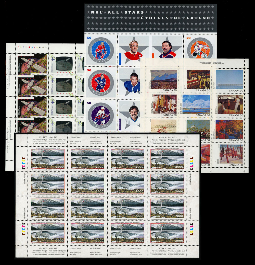 (#966A/1836) CANADA MNH SHEETS 1982-2000, 57 MNH mini sheets with 30¢-50¢ stamp denominations, a few duplicates including #1431a (x7) with cat $175 alone, face value $760 CDN, VF est ($150+ US) (Image)