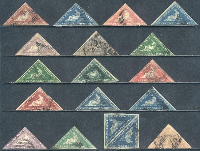 Lot of 16 triangular stamps + one pair mounted on 2 stock cards, fine to VF quality, Scott catalog value over US$5,000, good opportunity! (Image)