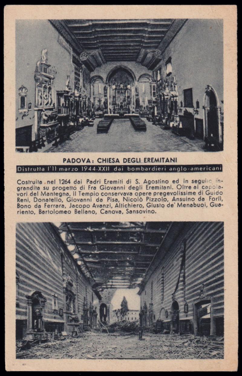 1944 PROPAGANDA ANTI ALLEATA - MON. DISTRUTTI. Padova, la serie di 4 cartoline monocrome delle chiese degli Eremitani (3) e San Benedetto, viaggiate nel gennaio/marzo 1945 (Arrasich 73/76). Rare. (Image)