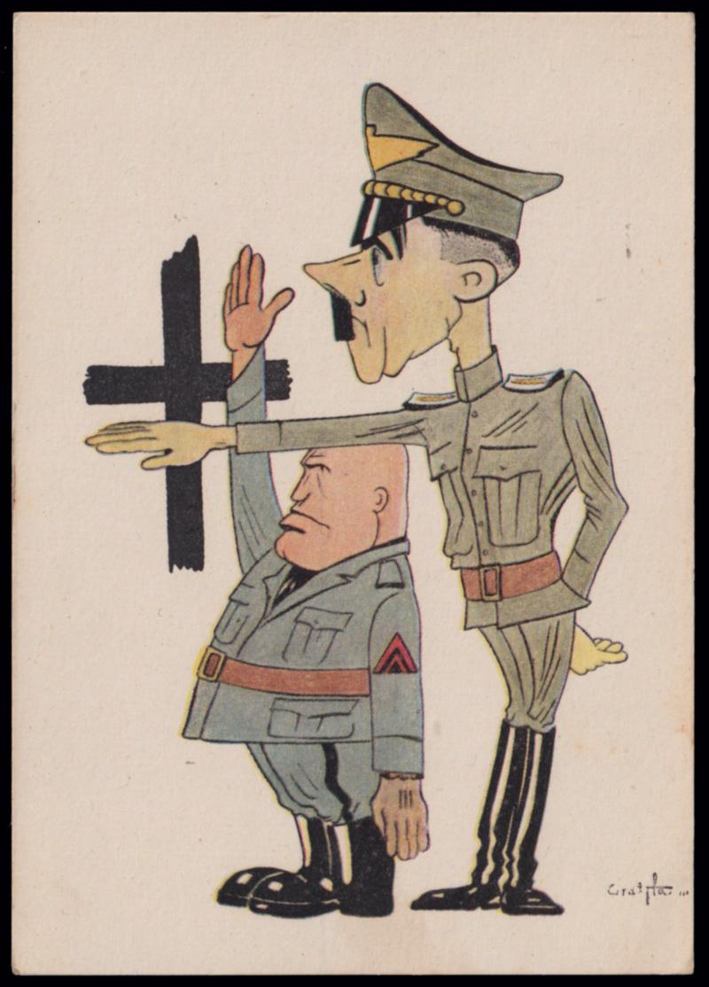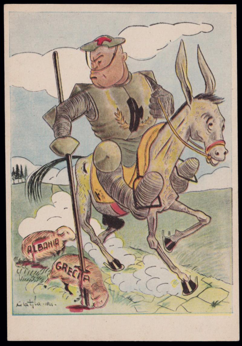 PROPAGANDA ANTIFASCISTA GRECA. Cartolina policroma satirica della disfatta navale italiana di Capo Matapan, nuova. Ex collezione Egidio Errani. (Image)
