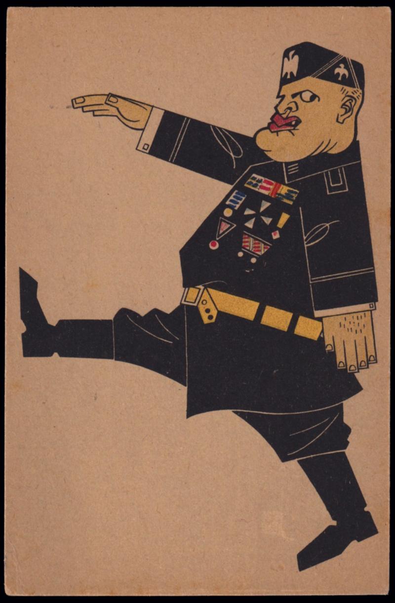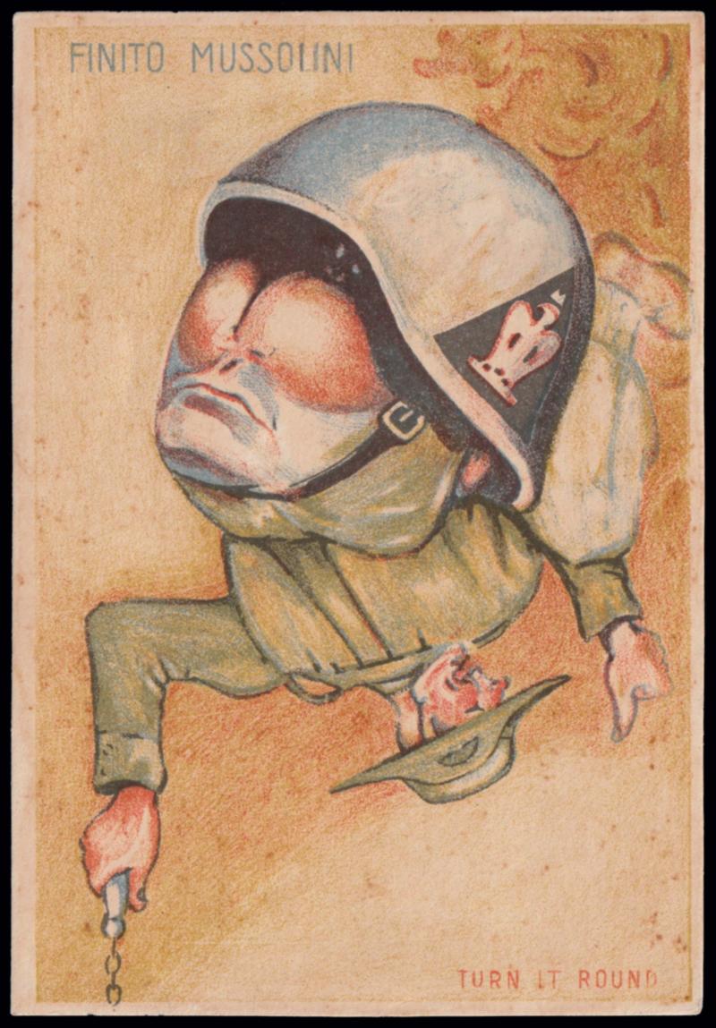 PROPAGANDA ANTIFASCISTA INGLESE. Cartolina policroma FINITO MUSSOLINI Turn It Round, nuova. Ex collezione Egidio Errani. (Image)