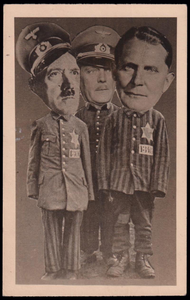 PROPAGANDA ANTINAZISTA. Cartolina monocroma Hitler, Goering, Goebelsin tenuta di Campo di concentramento, nuova con scritte al retro. Rara. Ex Collezione Egidio Errani. (Image)