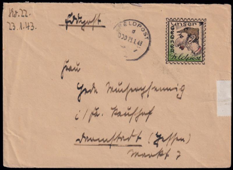 PROPAGANDA TEDESCA. Lettera viaggiata tramite Feldpost tedesca il 23/1/1943 con francobollo disegnato con caricatura e dicitura "Unser Gesner - Feldpost". Ex collezione Egidio Errani. (Image)