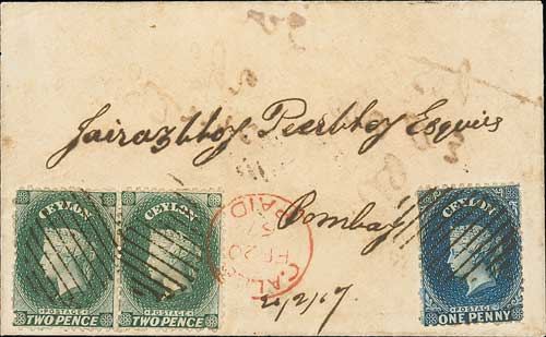 1867 Cover to Bombay franked 1863-66 1d and 2d grey-green pair with barred oval cancels, the pair also tied by red Galle Paid c.d.s, an attractive cover. Photo on Page 114. (Image1)