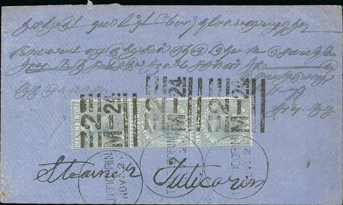 1879 Cover to India endorsed "Steamer Tuticorin" with 4c grey vertical strip of three each cancelled by "TUTICORIN / M-24" duplexs, an unusual cover with Ceylon stamps cancelled in India. Photo on Page 114. (Image1)
