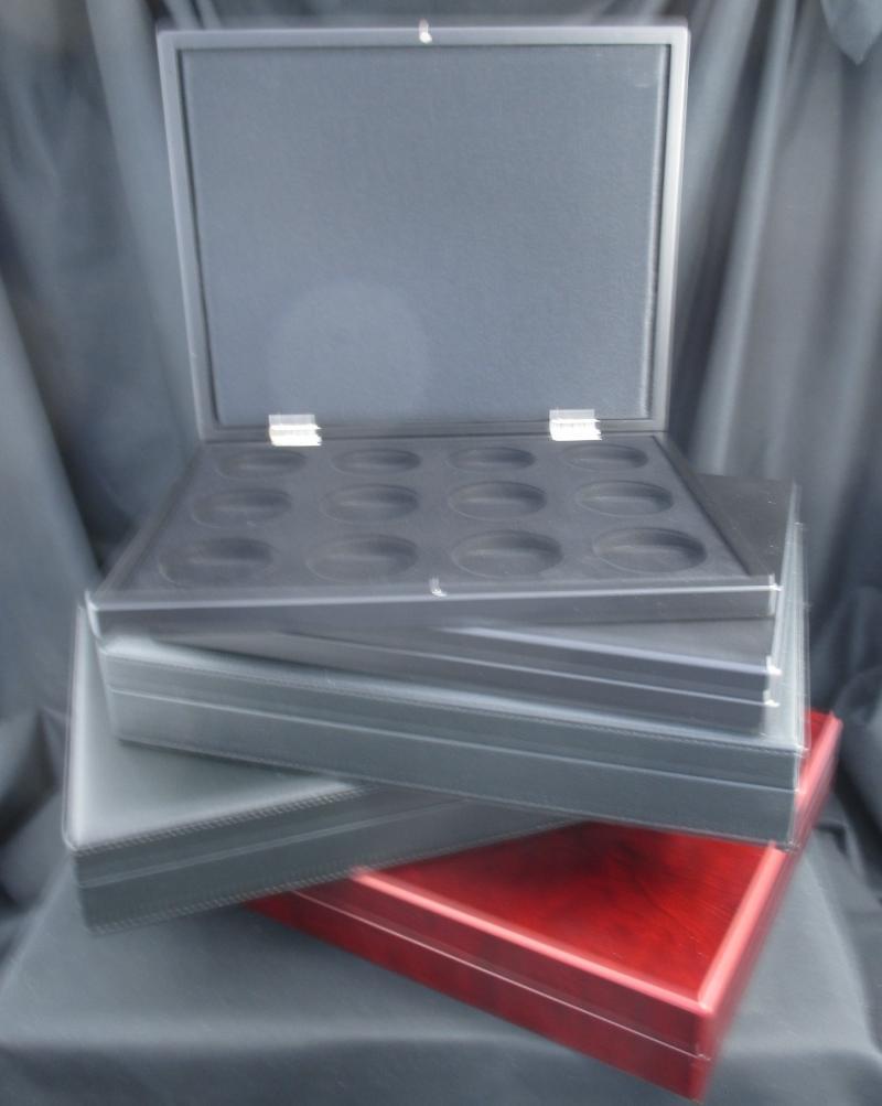 Silver Stacker coin display cases by Lighthouse with twenty-coin felt based holders for Australian '1oz Kookaburra', and '1oz Kangaroo'; Austria 'Weiner Philharmoniker 1 Unze Feinsilber'; Canadian Maple Leaf 1oz' x2 boxes; China Silver Pandas x3; Great Britain 'Britannia 1oz'; and United States 'American Eagle Silver Dollars', and forty-coin (two shelf) cases for 'Morgan Silver Dollars' and American Eagle Silver Dollars', all 'as new'.