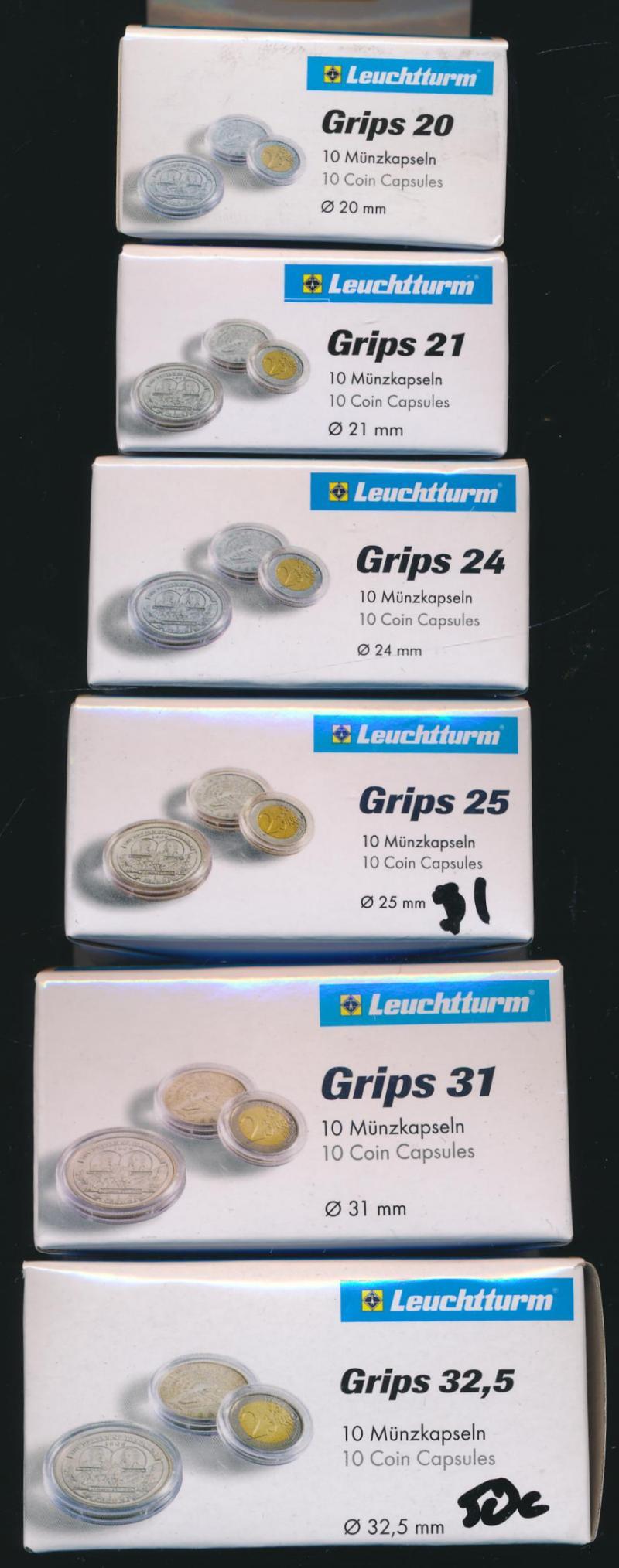 Lighthouse Grips coin capsules 20mm to 41mm (x92 in boxes of 10), plus 31mm to suit Australian or British 1d (x800) in four boxes of 200. (1720 capsules) (Image1)